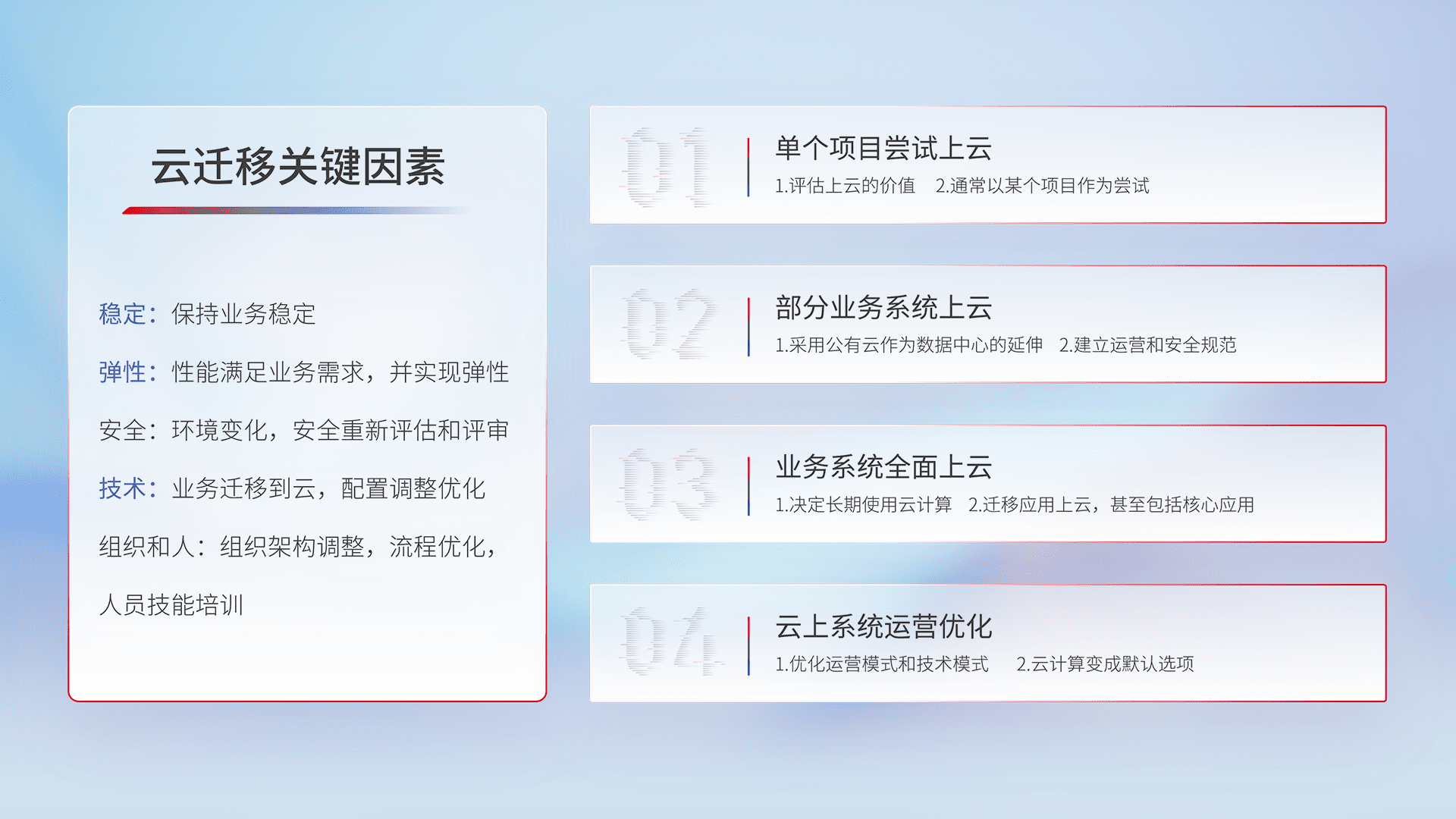 结合实际业务,,从规划设计、、、云平台选型、、云原生改造、、、、数据迁移、、、、集成交付,,,,迁移全过程为客户识别最佳上云路径,,做好风险识别管理,,,设计网络架构、、、身份权限、、安全审计合规、、、操作审计、、、日志审计、、监控告警策略、、多站点容灾设计等,,,,对云上基础设施进行整体规划,,,,提升IT治理水平,,,,以满足弹性、、高可用、、、高性能的需求。。。