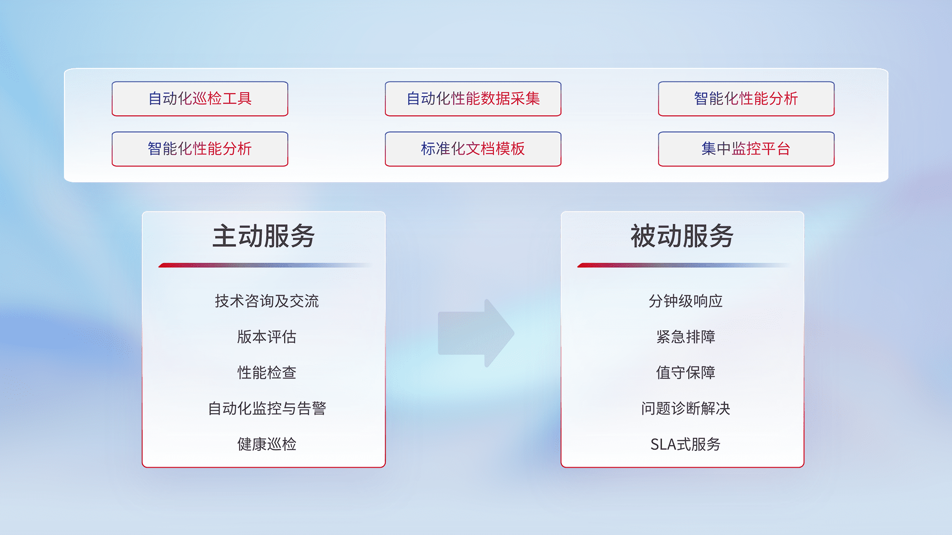 智能化工具和标准化文档,,,保障服务质量,,,,提供主动服务(包含技术咨询、、、、版本评估、、性能检查、、、自动化监控与告警、、、健康巡检)和被动服务包含(分钟级响应、、紧急排障、、值守保障、、问题诊断解决、、SLA服务)。。。。